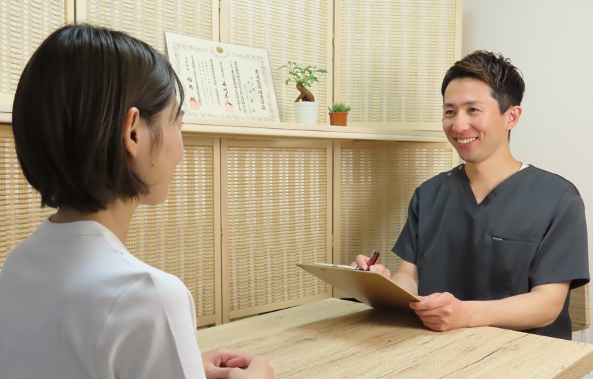むち打ち症は、事故直後は軽い違和感程度でも、数日から数週間後に首の痛み、頭痛、めまい、吐き気、しびれ、倦怠感などが出てくることが少なくありません。そのため当院では、まず丁寧にお話を伺い、事故の状況や現在の体の状態を一つひとつ確認することを大切にしています。